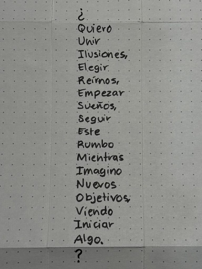 Ahora, para este final que no es el gran final; esta es mi prosa poética: Quiero unir ilusiones, elegir reírnos, empezar sueños, seguir este rumbo mientras imagino nuevos objetivos, viendo iniciar algo.